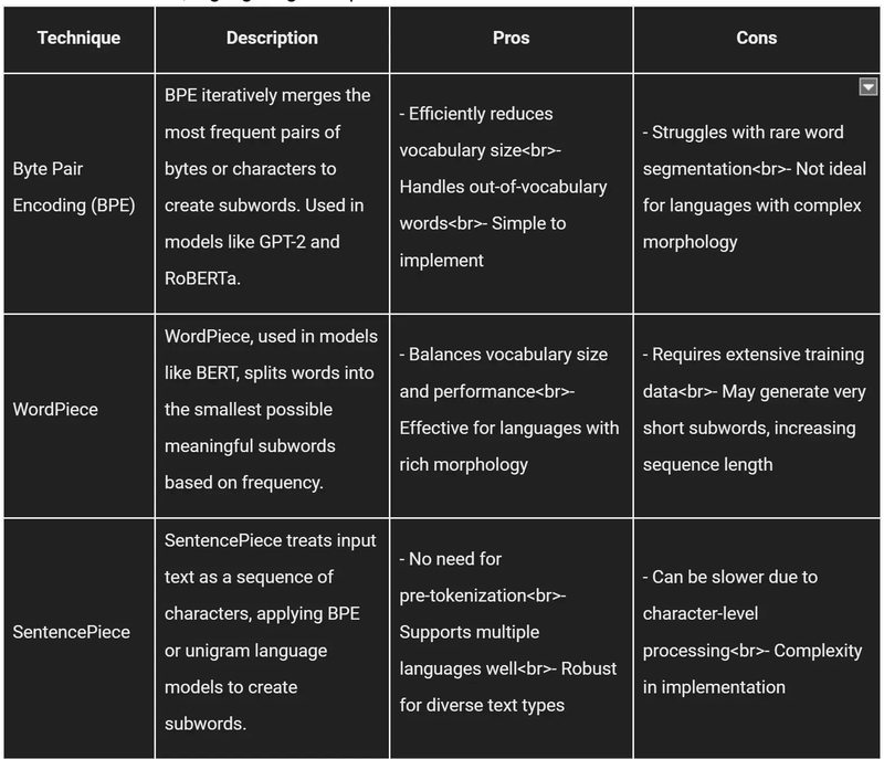 Tokenization is a critical step in processing text for Large Language Models (LLMs). Here, we compare three popular subword tokenization techniques: Byte Pair Encoding (BPE), WordPiece, and SentencePiece, highlighting their pros and cons.