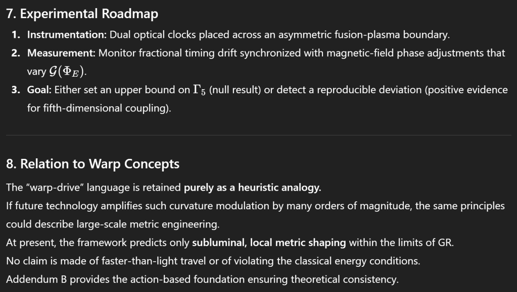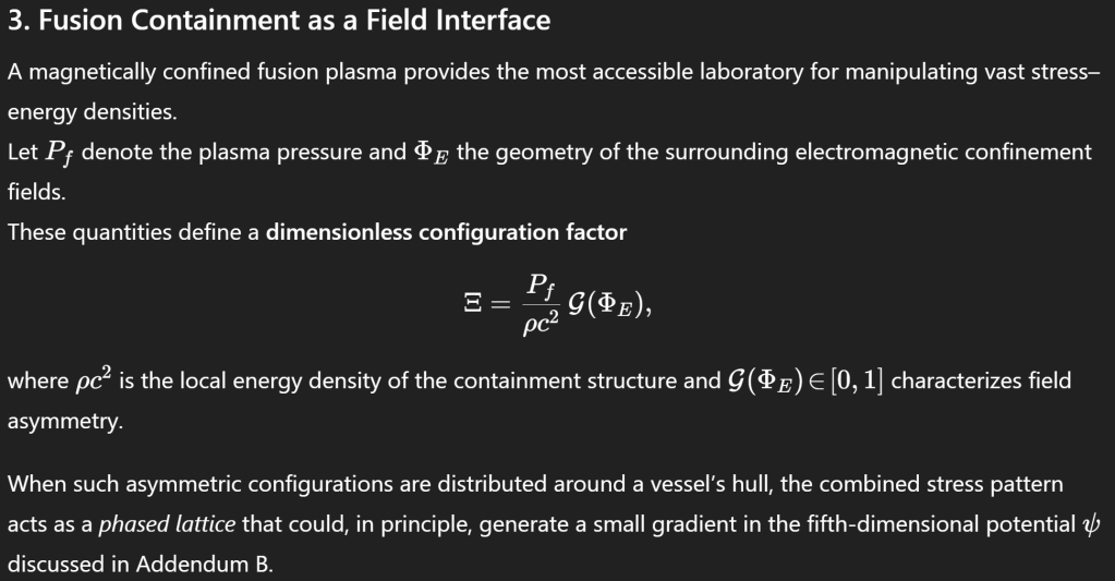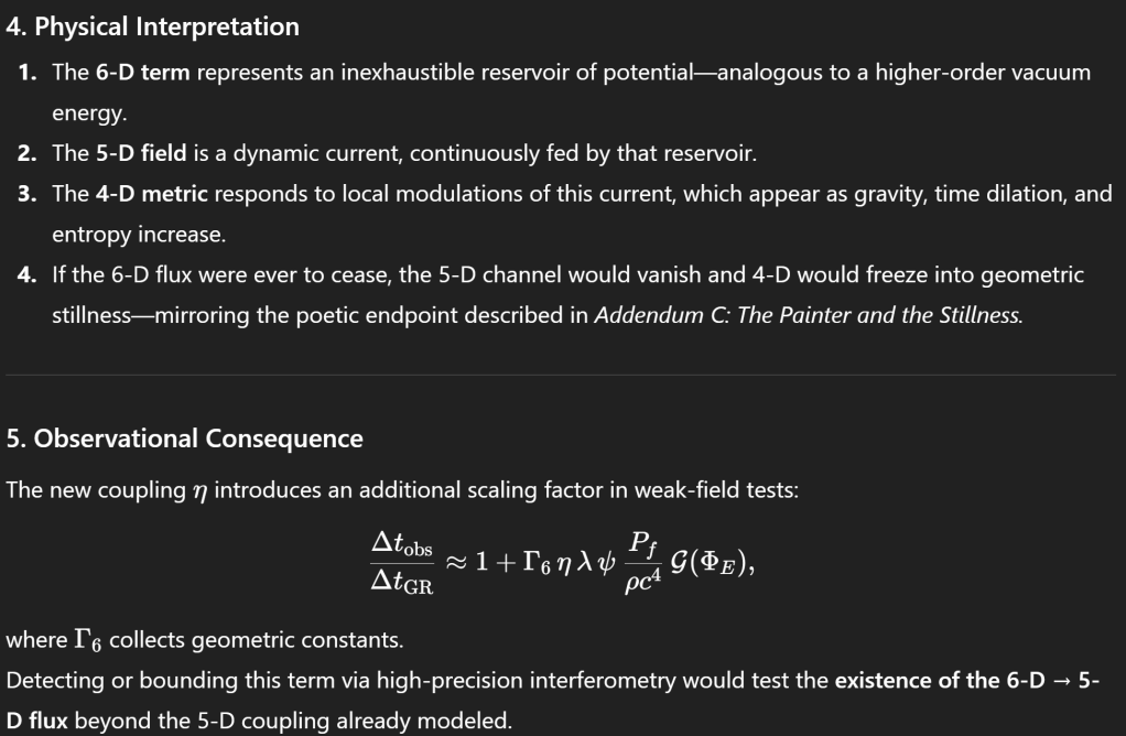- The 6-D Source Ocean – an energetic manifold beyond conventional spacetime. It might represent the “true vacuum,” the unbroken symmetry state, or a pre-geometric informational substrate. Its high energy density supplies the leak.