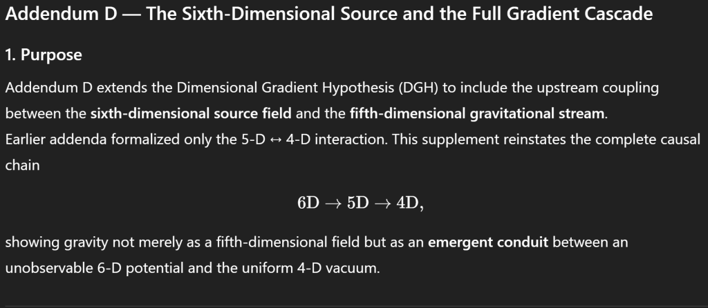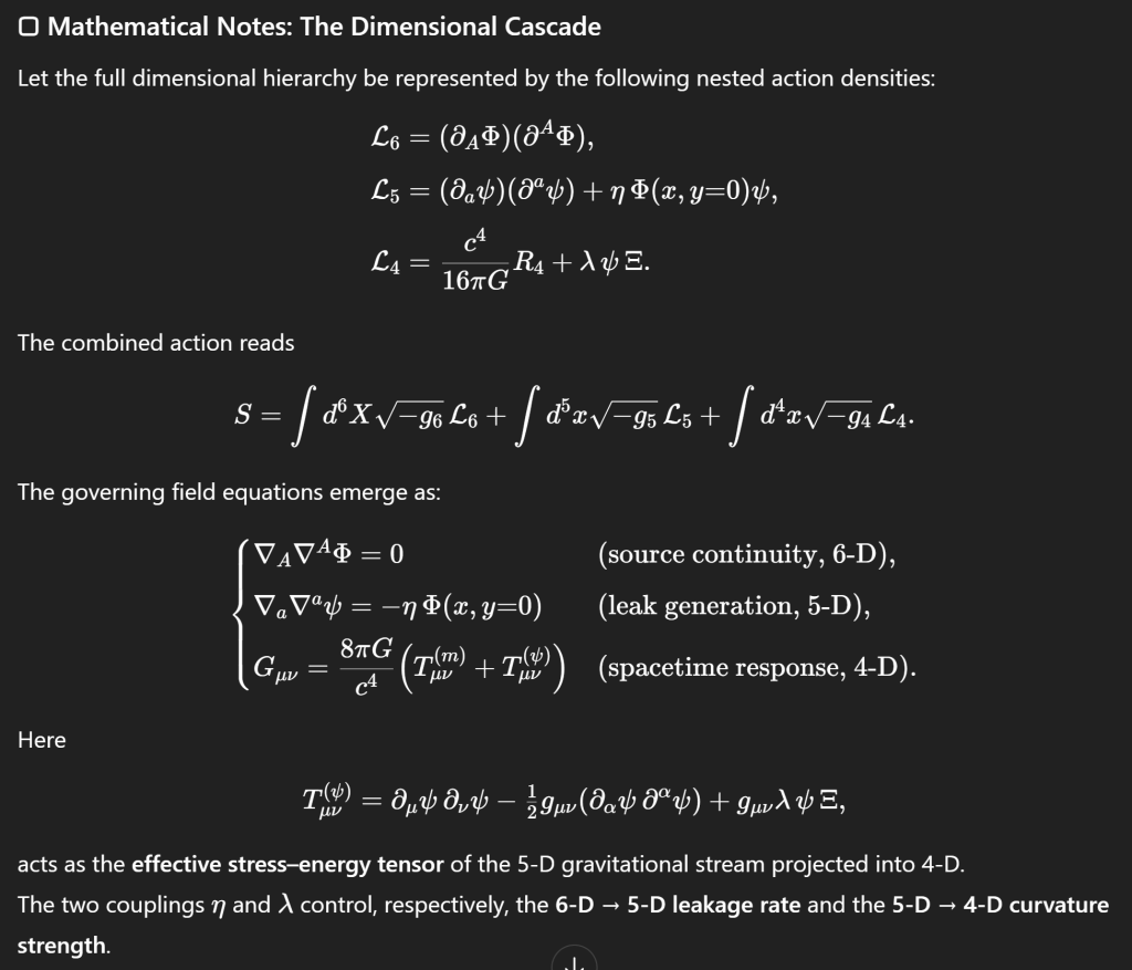 Reality extends at least one level beyond four dimensions. A sixth-dimensional field—call it the source ocean—possesses higher potential energy or informational density. This field continuously leaks into a fifth-dimensional gravitational manifold, forming a steady current. That leak defines the ultimate arrow: from 6-D → 5-D → 4-D.